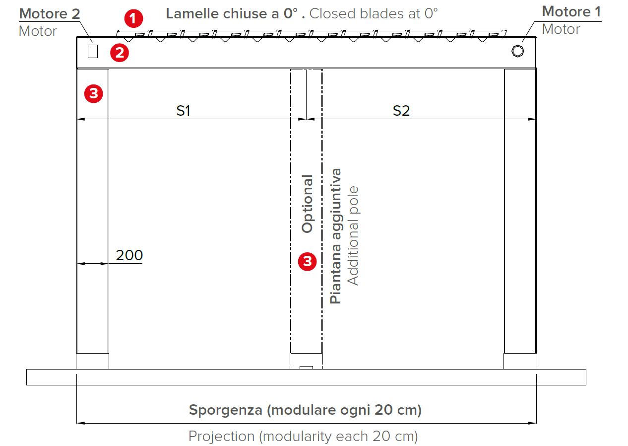Střecha pergoly se skládá z hliníkových lamel, každá o šířce 22,8 cm a výšce 5,2 cm. Díky dvěma samostatným motorům lze lamely nejen natáčet, ale i přesunout na stranu. Lamely lze podle potřeby otevřít v rozmezí 0° až 70°. Podle orientace lamel bude konstrukce nabízet úplnou nebo částečnou ochranu před sluncem, bezpečný úkryt před deštěm a příjemný prostor díky možnosti prostupu teplého vzduchu střechou.