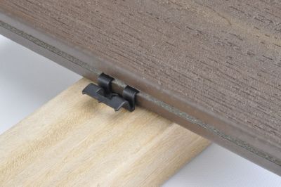 Při montáži dřevoplastové terasy Fiberon se používají speciální klipy Cobra pro skryté připevňování plných kompozitních desek s podélnou boční drážkou k podkladnímu roštu.
