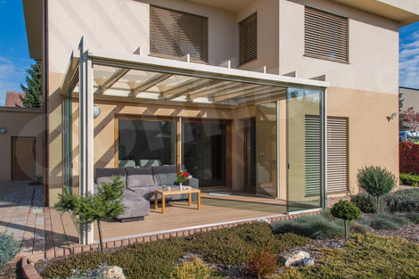 Pojďte si prohlédnout zblízka terasovou podlahu Millboard pod proskleným zastřešením v domácím prostředí.