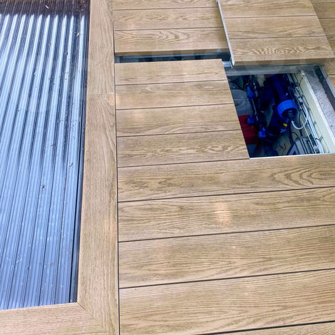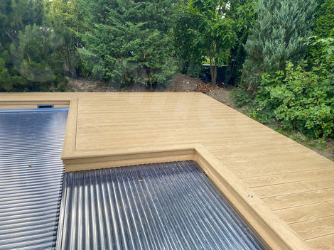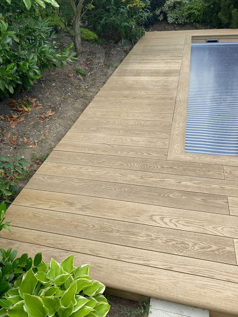 77Nakoukněte do zahrady, kde se skrývá krásný bazén v netradičním tvaru a s Millboard terasou v barvě Golden Oak.