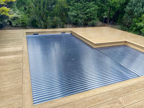 Nakoukněte do zahrady, kde se skrývá krásný bazén v netradičním tvaru a s Millboard terasou v barvě Golden Oak.